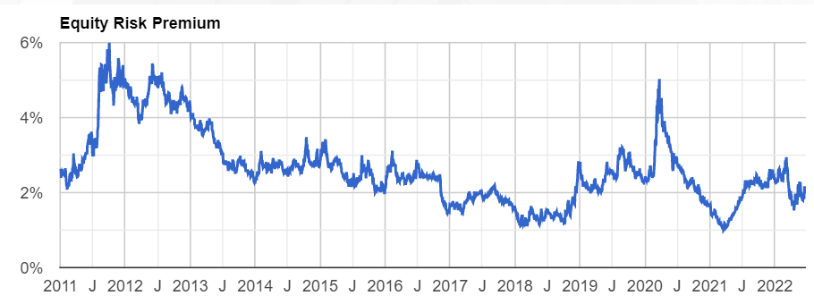- Equity Risk Premium: the return investors require over the risk free rate (10 year treasury yield)
