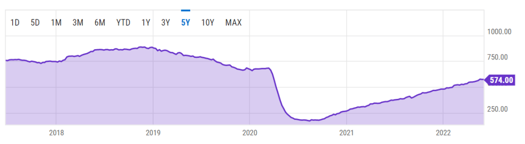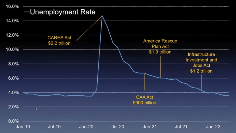 Let’s talk about the economy. Not good. 1st quarter GDP growth came in at -1.5%. 2nd quarter GDP growth is currently forecasted at 0% according to the Atlanta Fed’s Nowcast. Could things turn around in the 2nd half of the year? Unlikely: the economy will have to fight tightening monetary policy and face an absence of fiscal stimulus (compared to most of the Covid period – see below for the stimulus timeline).